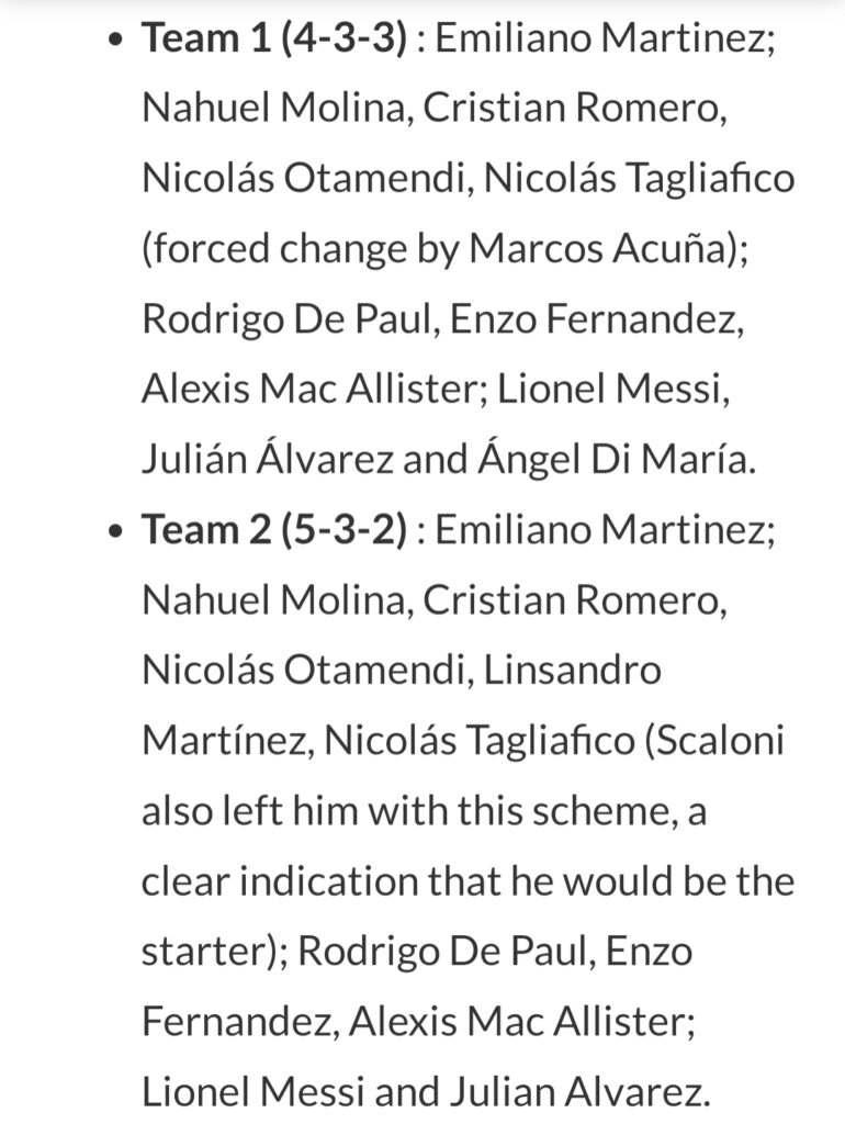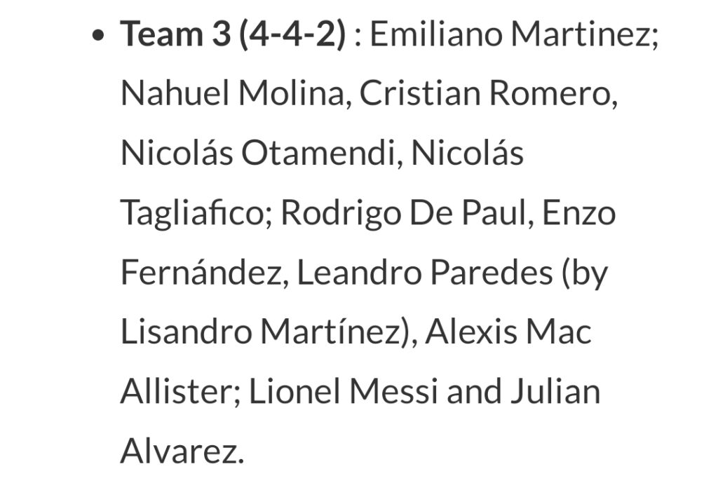 കഴിഞ്ഞ ദിവസത്തെ പരിശീലനത്തിൽ മൂന്ന് ഫോർമേഷനുകളെയാണ് അർജന്റീനയുടെ പരിശീലകൻ പരീക്ഷിച്ചിട്ടുള്ളത്. ഇതിൽ ഏത് ഫോർമേഷനെയാണ് കളത്തിലേക്ക് ഇറക്കുക എന്നുള്ളത് വ്യക്തമല്ല. കഴിഞ്ഞ മത്സരത്തിൽ അഞ്ച് ഡിഫൻഡർമാരെ വെച്ചു കൊണ്ടായിരുന്നു സ്കലോണി അർജന്റീനയെ ഇറക്കിയിരുന്നത്. അതേസമയം 4 മിഡ്ഫീൽഡർമാരെ വെച്ചുകൊണ്ടുള്ള ഒരു ഫോർമേഷനും ഇത്തവണ സ്കലോണി ആലോചിക്കുന്നുണ്ട്.ഏതായാലും ഇന്നലത്തെ പരിശീലനത്തിൽ പ്രയോഗിച്ച മൂന്ന് ഫോർമേഷനുകൾ താഴെ നൽകുന്നു.